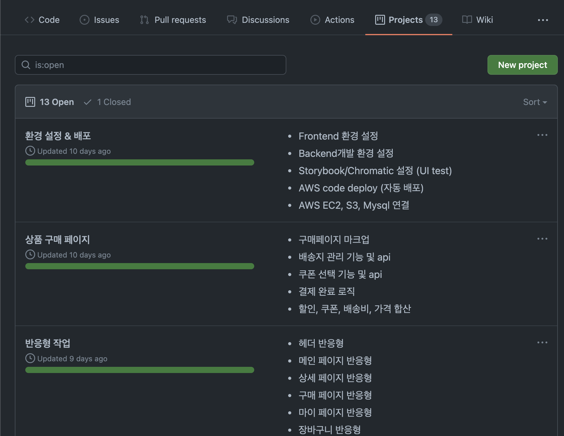- 이 번 프로젝트에서는 깃을 기똥차게 사용한 것으로 생각된다. Discussion이라는 탭을 이용하여 주요 안건사항들을 올려 슬랙과의 별개로 다룰 수 있게 하였고 (이 것은 주요 내용을 빠르게 확인 할 수 있다는 장점이 있다.), github action을 사용하여 [client, server, chromatic] 으로 나누어 자동배포를 구현하였다. 또 Project 탭을 이용하여 단순히 이 프로젝트 전체가 아닌 크게 페이지 단위로 나누어 이슈를 부분부분 연결하고 진행도를 쉽게 파악하여 일을 정리 하는 장점이 있었다. 아마 다음 프로젝트에서도 깃 프로젝트 디스커션을 잘 이용할 수 있을 것 같다. 각탭 별로 다음 이미지와 같이 사용하였다.